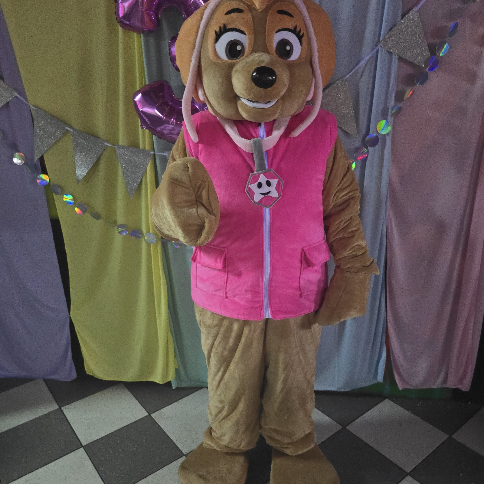 Maskot Skye z Tlapkové patroly, kterou miluji všechny děti.